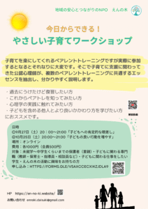 NPOえんの木では、子育てや対人支援に役立つ2つのオンラインワークショップを開催します。ご自身の興味や目的に合わせて、ぜひご参加ください。